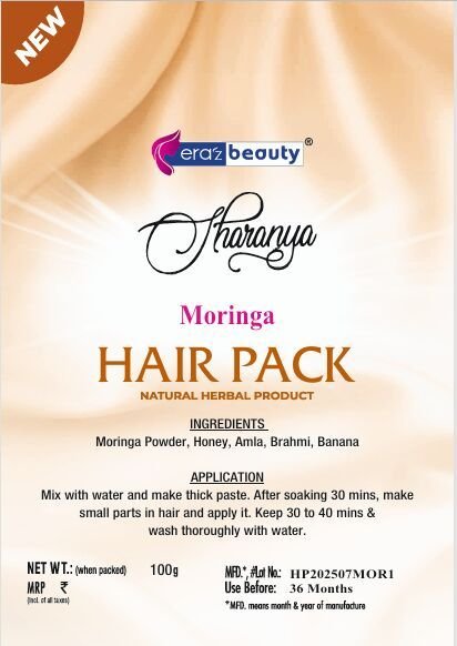 We offer the Eraz Beauty Sharanya Heena Hair Pack, a 100gm hair pack in a plastic pouch. This hair pack is a blend of Heena, Rice, Aritha, Jatamasi, Amla, Raktchandan, and Shatavari for hair conditioning and coloring. With a shelf life of 36 months, this product is perfect for manufacturers, exporters, and suppliers. The HSN code is 33049910/33049990, and the batch number is HP202507HEN1. Enhance your hair care routine with this natural and effective hair pack from Eraz Beauty.