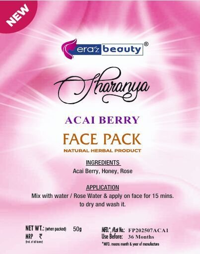 We offer a nourishing Sharanya Acaiberry Face Pack suitable for all skin types. Packed in a 50gm purple pack, this face pack is enriched with ACAIBERRY, HONEY, and ROSE ingredients. Batch No FP202507ACA1, HSN Code 33049910/33049990. Simply apply a thin layer on your face to experience the benefits of this unique blend. As a Manufacturer, Exporter, and Supplier, we ensure top-quality skincare products for your beauty routine.