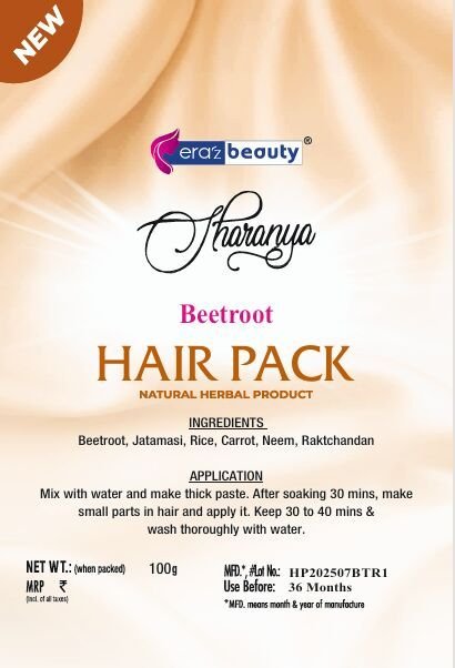 We are Eraz Beauty, a leading Manufacturer, Exporter, and Supplier of premium hair care products. Our Sharanya Beetroot Hair Pack comes in a convenient pouch packaging of 100gm, with a shelf life of 36 months. This nourishing hair pack is enriched with a blend of Beetroot, Rice, Carrot, Neem, Jatamasi, Raktchandan, and Heena for a natural base. Simply apply on damp hair to experience the benefits of improved hair health. With a harmonious mix of ingredients, this hair pack is designed to nourish and revitalize your hair. Batch No: HP202507BTR1. HSN Code: 33049910/33049990.
