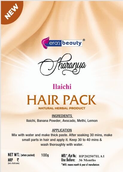 We are Eraz Beauty, a leading Manufacturer, Exporter, and Supplier of the Sharanya Ilaichi Hair Pack. Our plastic sachet packaging contains a nourishing blend of Ilaichi, Banana, Avocado, Methi, and Lemon, enriched with the delightful scent of Ilaichi fragrance. This 100g hair pack is designed to be applied directly to the hair, offering a unique combination of ingredients to promote hair health. Each batch is carefully labeled with Batch No HP202507ILA1 and falls under HSN Code 33049910/33049990. Experience the benefits of this hair pack that deeply nourishes and revitalizes your hair.